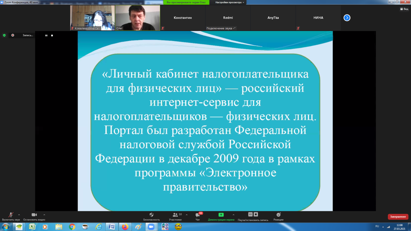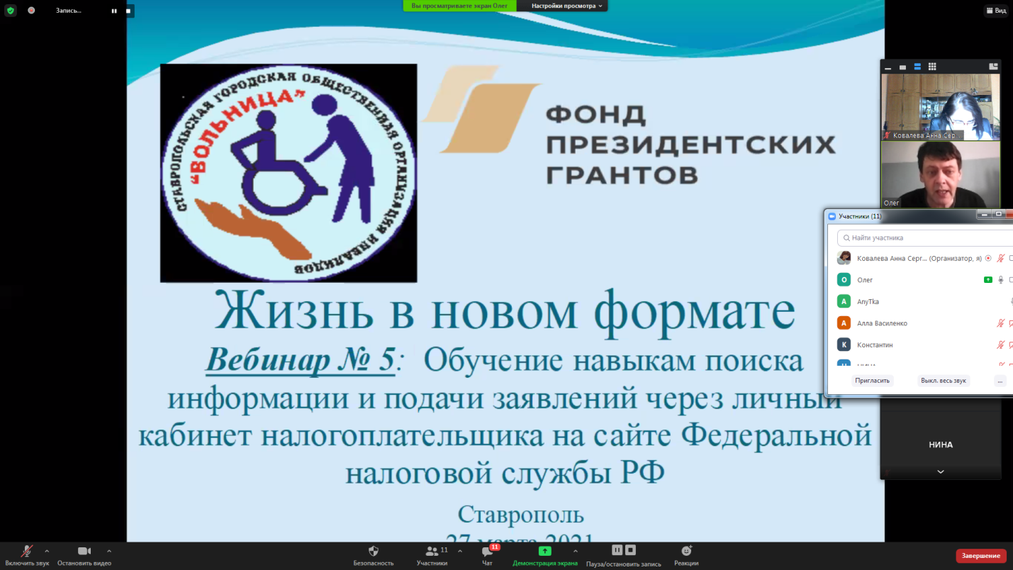 27 марта 2021 года в рамках социально значимого проекта «Жизнь в новом формате», реализуемого с использованием гранта Президента Российской Федерации, предоставленного Фондом президентских грантов, Ставропольской городской общественной организацией инвалидов «Вольница» был проведен очередной вебинар по обучению навыкам получения информации и необходимых услуг посредством сети «Интернет». В этот раз родители детей с инвалидностью получили навыки поиска информации и подачи заявлений через личный кабинет налогоплательщика на сайте Федеральной налоговой службы РФ.